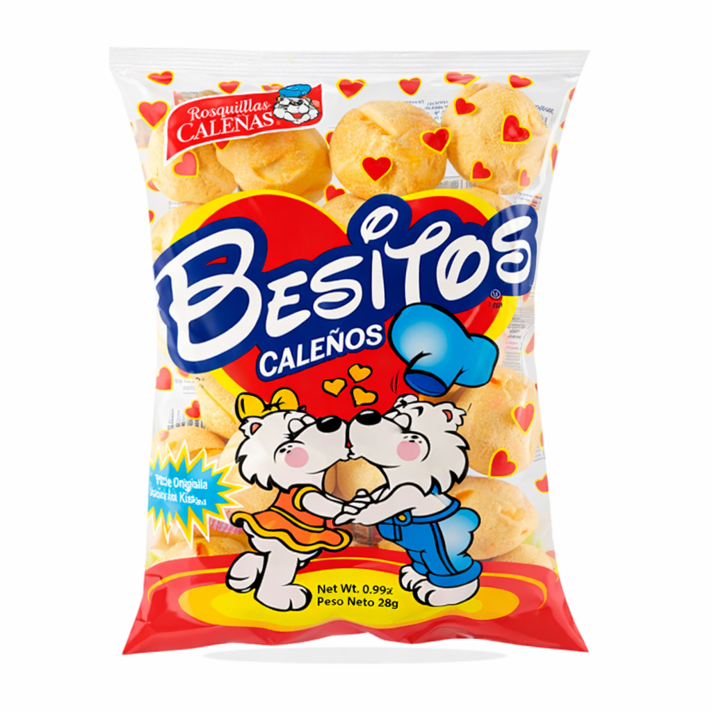 Display de 12×50 Besitos Calenos. Delicioso producto bajo en grasa y sin azucar elaborado de harina de yuca y queso perfectos para compartir en cualquier ocasión.